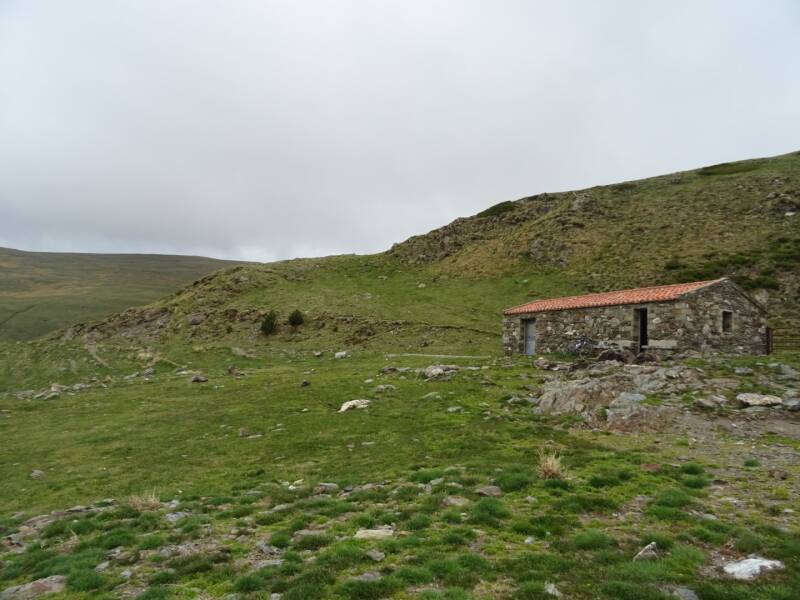 El que queda de l'antic Refugi d'Ulldeter, construït l'any 1909 a 2.389 m, amb el Gra de Fajol de fons